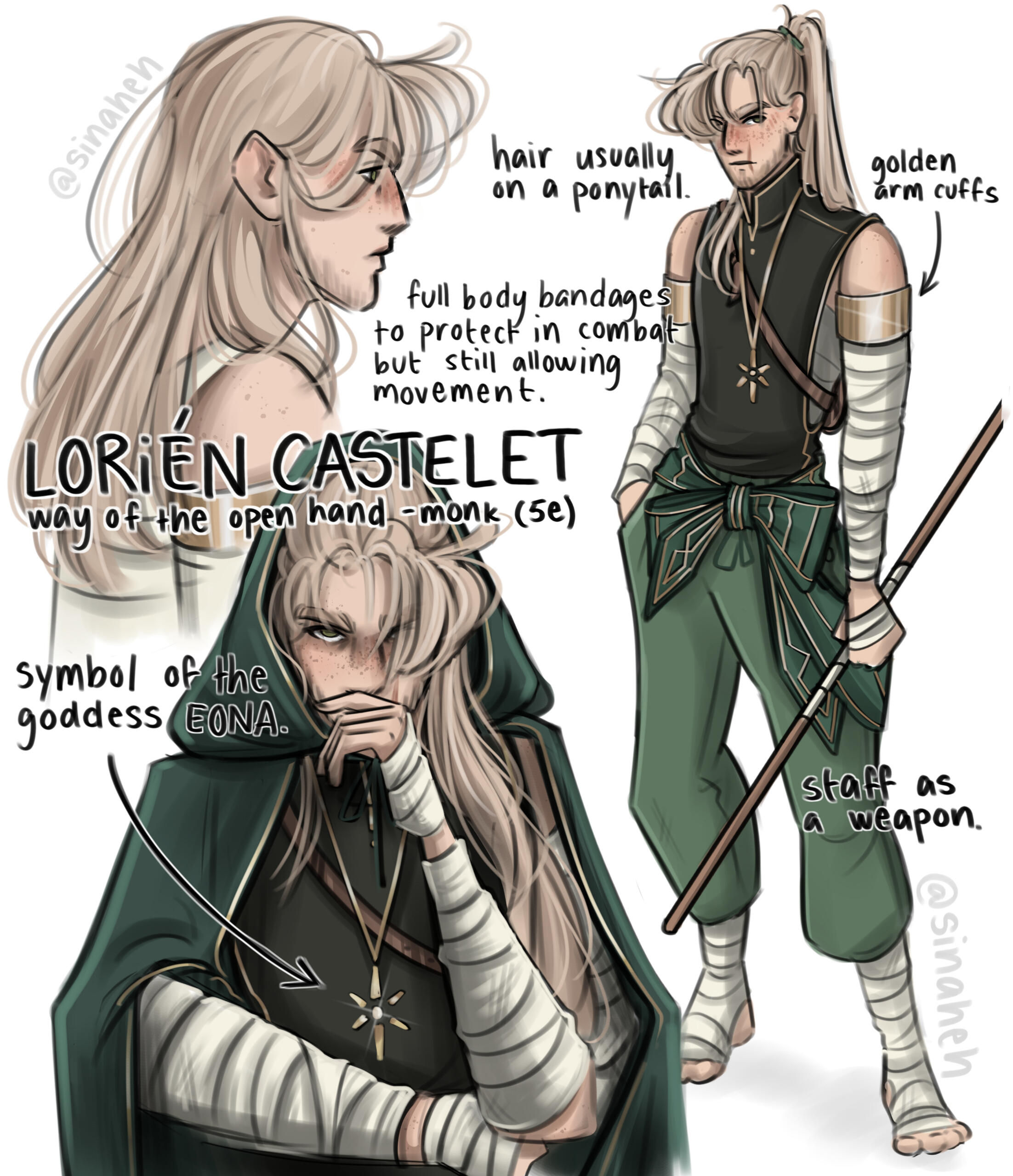 • Lorién Castelet is the Bastard Prince of Bright Capital and the son of the Queen. He's currently the head of the Monastery: Abbey of Eona.• He was disowed by the Royal couple and banished from the castle after assassinating the Prince, his younger brother, Kal.• He has blonde long hair and bangs that falls on one side of his face. The hair is mainly kept in a high ponytail but in some occasions he might braid it. Rarely is it seen completely open.• He has piercing green eyes, some freckles and a single scar on top of his lip that seems very out of place. He usually wears his monastery uniform and wrappings similar to Leo's.• Lorién's go to weapon in fight is his quarterstaff or his fists.